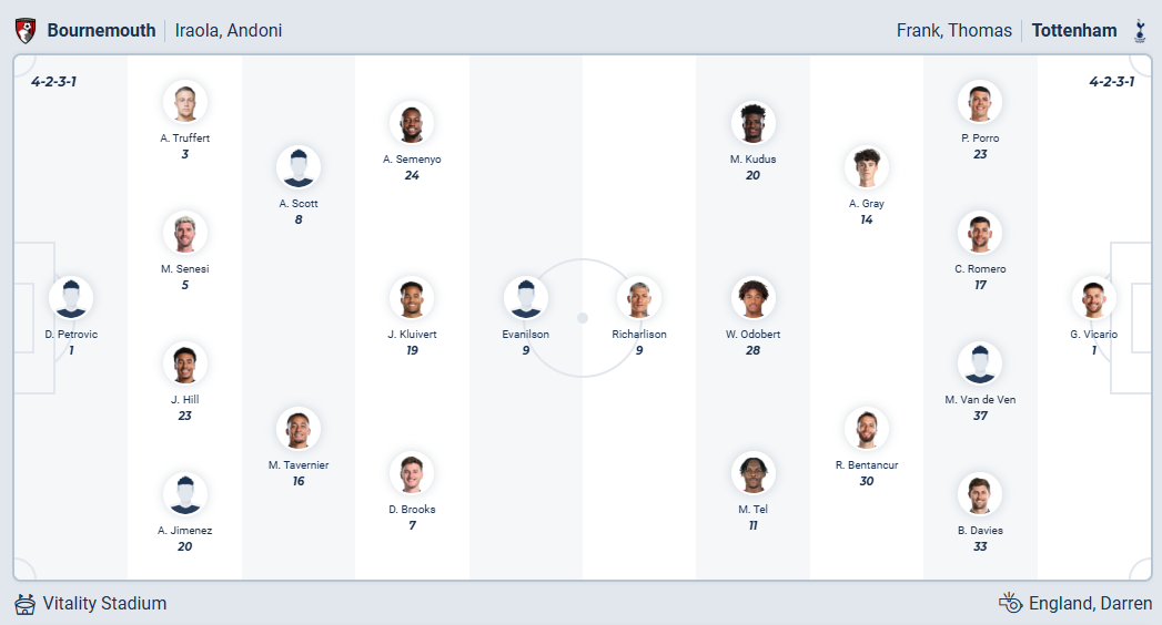 Bounemouth đã tụt xuống vị trí thứ 15 sau chuỗi trận không thắng liên tiếp vừa qua, so với giai đoạn thăng hoa đầu mùa giải thì rõ ràng đội bóng của HLV Andoni Iraiola thể hiện một bộ mặt rất đáng thất vọng và họ cần giành chiến thắng để có thể cải thiện thứ hạng của mình. Họ đặt mục tiêu đó khi đón tiếp Tottenham ở vòng đấu thứ 21, tuy nhiên trước đối thủ cũng đang rất cần điểm và có chất lượng đội hình tốt thì việc giành chiến thắng là rất khó khăn. Nhiều khả năng Bournemouth sẽ chỉ có kết quả hòa ở trận đấu này.