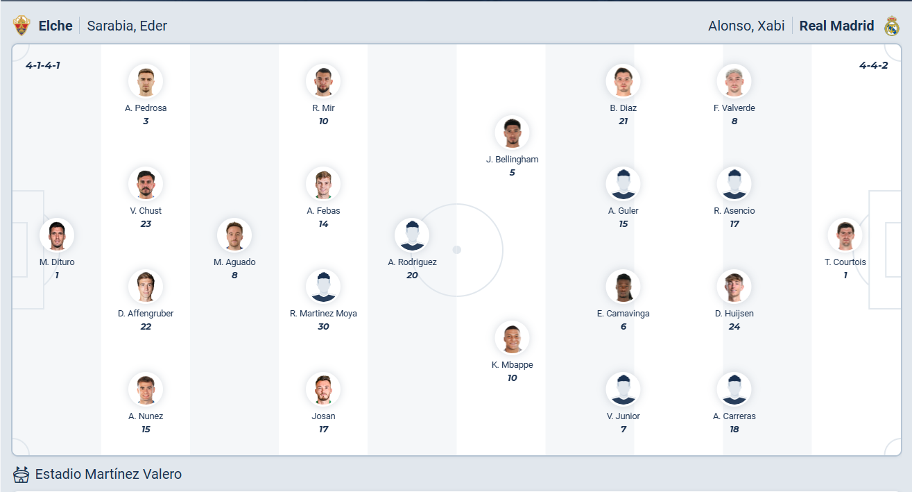 Real Madrid vừa trải qua 2 trận liên tiếp không thắng, trận hòa tại La Liga ở vòng đấu trước khiến khoảng cách của họ với Barcelona bị rút ngắn xuống còn 3 điểm. Chính vì vậy đội bóng của HLV Xabi Alonso cần ngay lập tức giành chiến thắng trở lại để duy trì vị trí đầu bảng của mình. Đến làm khách trên sân của đội bóng mới thăng hạng Elche, Real Madrid không những phải thắng mà phải thắng làm sao cho đẹp. Với đội hình mạnh hơn hẳn thì nhiều khả năng họ sẽ không gặp nhiều khó khăn để ra về với chiến thắng cách biệt.