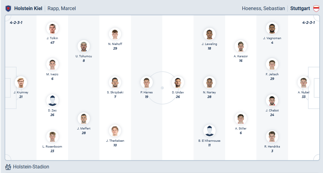 Stuttgart đang chơi tốt mùa giải này dù họ không phải đội được đánh giá cao, vị trí thứ tư trên bảng xếp hạng Bundesliga cho thấy điều đó và thầy trò HLV Sebastian Hoeneß hoàn toàn có thể hy vọng vào tấm vé dự Champions League mùa tới. Các cầu thủ Stuttgart muốn chơi tốt cả ở cup Quốc gia và họ muốn đi càng xa càng tốt, ở tứ kết họ chỉ phải đến làm khách trên sân của đội bóng hạng dưới Kiel nên cơ hội giành chiến thắng rất cao. Nhiều khả năng phong độ tốt thời gian gần đây sẽ giúp Stuttgart chơi tốt và có chiến thắng ra về.