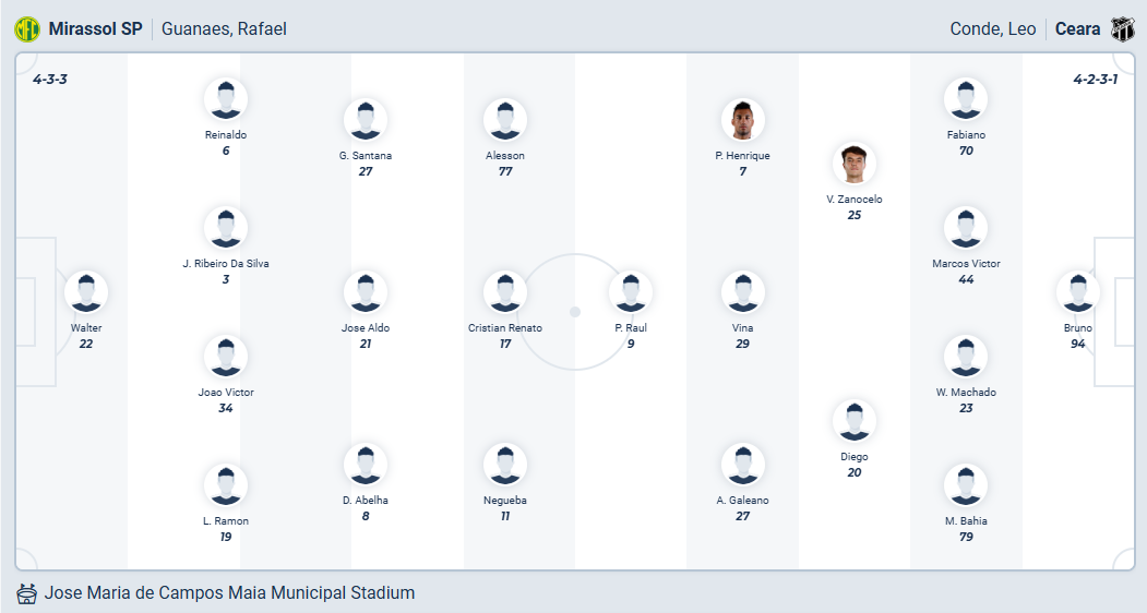 Mirassol mới thăng hạng lên chơi ở Serie A ở mùa giải này, họ không được đánh giá cao nhưng đang khiến tất cả phải bất ngờ khi đứng thứ tư trên bảng xếp hạng ở thời điểm mùa giải sắp khép lại. Cơ hội giành chức vô địch có lẽ quá xa với và bản thân các cầu thủ Mirassol cũng không nghĩ đến điều đó, điều mà thầy trò HLV Rafael Guanaes hướng đến trong các trận còn lại có lẽ là giữ vị trí thứ tư để đá Copa Libertadores mùa tới. Họ cần thắng trước Ceara ở vòng 35 này để giữ vị trí đó, đây không phải điều khó thực hiện nếu đội chủ nhà cứ chơi như thời gian qua.