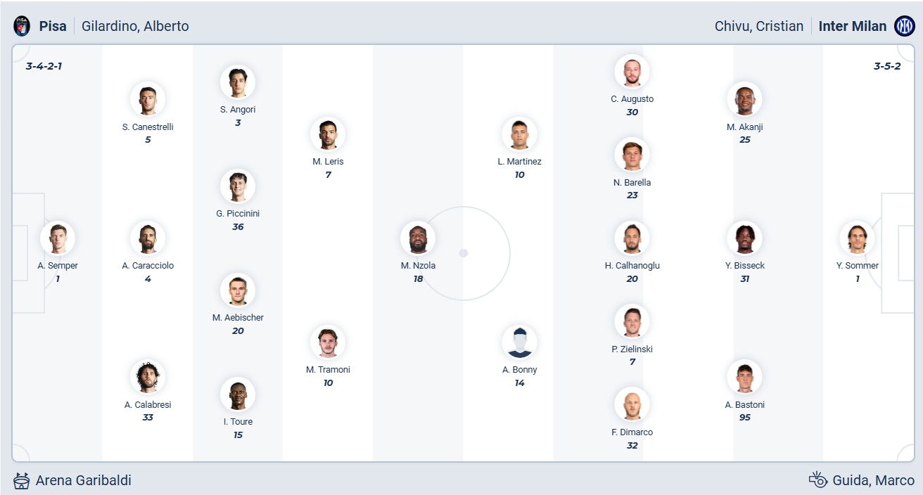 Inter đặt mục tiêu giành chức vô địch mùa này sau khi để hút ngôi vương mùa trước, nhưng họ đã tụt xuống vị trí thứ 2 trên bảng xếp hạng sau khi để thua đội bóng cùng thành phố Milan ở vòng đấu trước. Đây rõ ràng không phải điều khiến họ hài lòng và cần ngay lập tức trở lại với mạch chiến thắng để có thể tiếp tục cuộc đua vô địch. Chính vì vậy khi đến làm khách trên sân của Pisa thì 3 điểm là điều duy nhất mà các cầu thủ Inter hướng đến. Trước đối thủ mới thăng hạng có đội hình yếu hơn nhiều thì khả năng Inter sẽ chơi đủ tốt để có chiến thắng ra về.