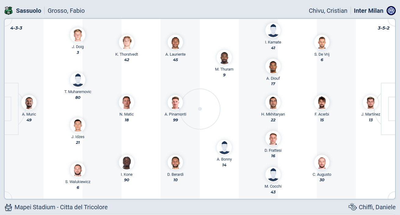 Sassuolo là đội bóng mới thăng hạng mùa giải này, mục tiêu của thầy trò HLV Fabio Grosso sẽ chỉ là trụ hạng. Với mục tiêu đó thì việc đang đứng thứ 11 ở thời điểm này là thành tích rất ấn tượng, 2 chiến thắng liên tiếp gần đây giúp ích rất nhiều cho thứ hạng này và các cầu thủ Sassuolo muốn tiếp tục kéo dài chuỗi trận kết quả tốt đó của mình. Nhưng đối thủ của họ ở vòng đấu thứ 24 lại là đội đầu bảng Inter nên mọi thứ được dự đoán rất khó khăn, nhiều khả năng Sassuolo sẽ không thể có điểm dù đã chơi đầy cố gắng.